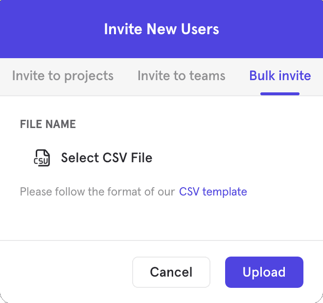 You may also bulk invite users by selecting Bulk invite and uploading a CSV file following the format of the provided CSV template linked in the UI.