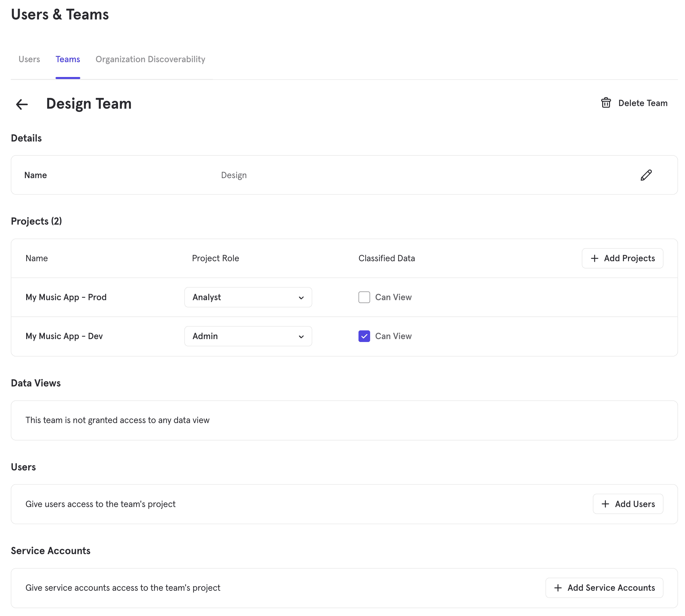 Deleting a team will revoke all access permissions that were granted to users and service accounts as part of their team assignments. Permissions given through other grant types will be retained.