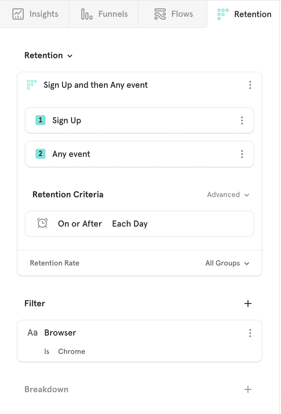 The retention behavior is the basic building block of a Retention report. A retention behavior is doing an event and then coming back to do another event. In this case, since we want to know retention after signup, choose “Sign Up Completed” in the first event slot. Then, we want to know if users are coming back and using the product, so choose “Any Event” in the second event slot. At this point, your query should look like this: